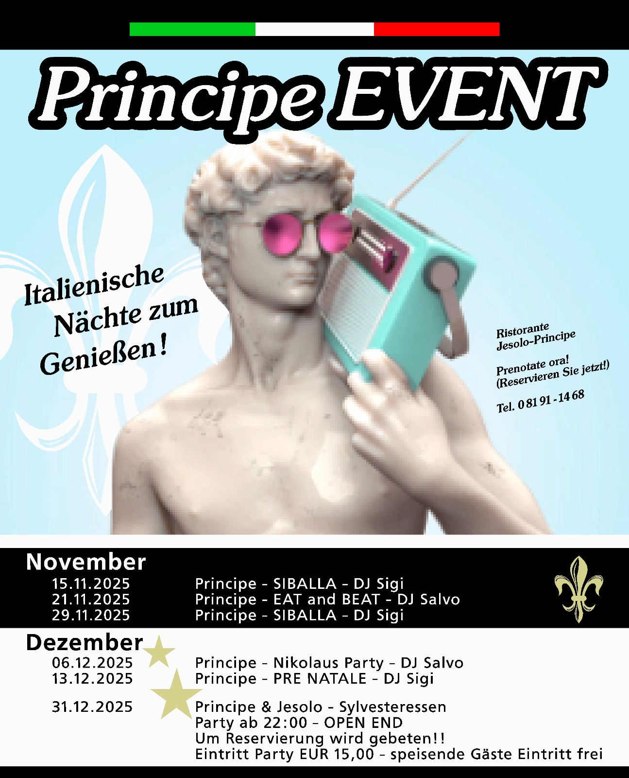 Erleben Sie im Jesolo & Principe die Vielfalt italienischer Gastkultur: TagsĂŒber entspannt im CafĂ© verweilen, abends exquisit im Restaurant dinieren. Unsere sonnige Terrasse lĂ€dt zum Verweilen in mediterraner AtmosphĂ€re ein.